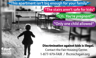 Pippens v Trkula is the fifth Fair Housing Center-aided familial status case filed since 2010. Recognizing the need for public education on the issue of discrimination against families with children, the FHC is conducting additional outreach concerning this issue by placing an ad (see below) in the April edition of the Ann Arbor Family Paper. The FHC also has plans to run this ad in other publications, in hopes that the ad will alert families to the possible signs of discrimination against children.