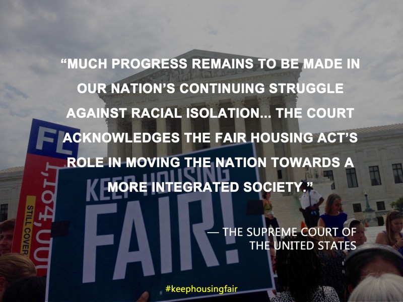 Last Thursday, June 25th, the Supreme Court of the United States voted 5-4 to keep a critical piece of its legacy: the disparate impact claim. This claim allows Americans to challenge not only laws, policies, and practices that are intentionally discriminatory, but also those that have an unjustified discriminatory effect.