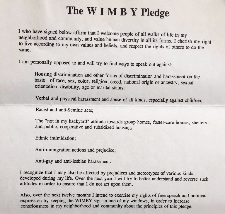 This is a page from the Winter of 1994. In response to hate crimes in Ann Arbor, our office worked with community leaders to start the WIMBY campaign (Welcome in My Backyard). We asked people to sign on to this Pledge and place a poster in their window indicating to the public their commitment to fostering a welcoming community. The campaign was about diversity, inclusion, understanding our own implicit bias, and challenging us to speak up against prejudices and stereotypes.
