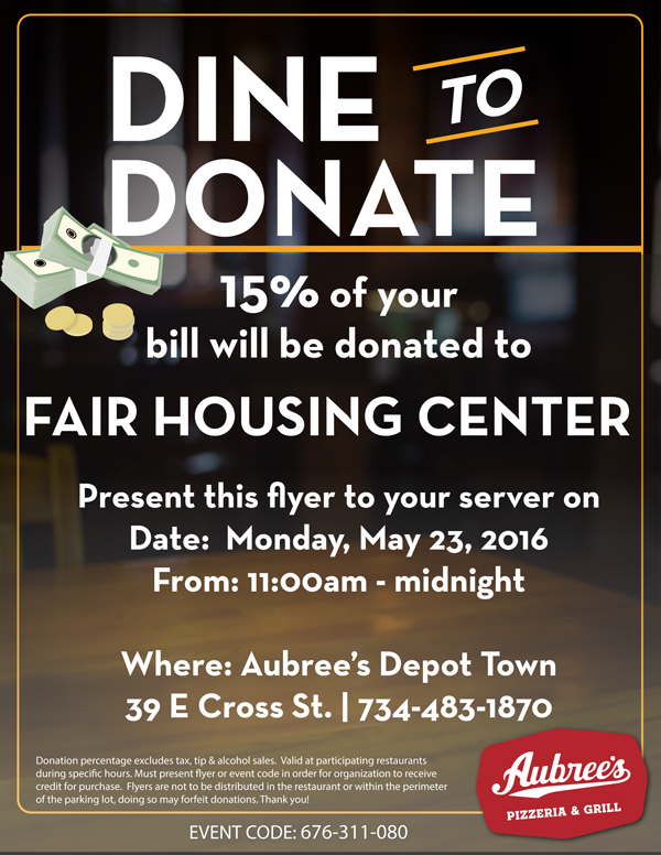 The Fair Housing Center will receive 15% of your bill between 11 AM and Midnight. You can order carry-out or delivery, buy a gift certificate, or dine in. You must show the flyer (you can show it from your phone) or give them this code: 676-311-080.