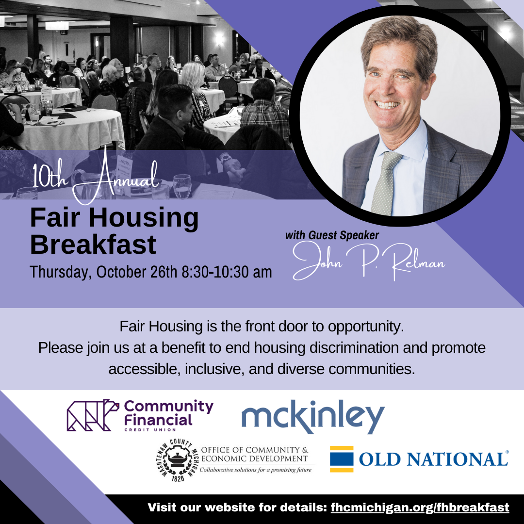 Tickets for the 10th Annual Fair Housing Breakfast are available now. For more information about the event, or the Fair Housing Center of Southeast & Mid Michigan, please visit www.fhcmichigan.org/fhbreakfast.